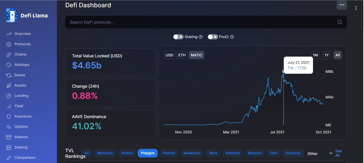7/8 Cuando analizamos el TVL de los protocolos #DeFi en la red #Polygon medido en el token de la red que es el #MATIC ha sido el 21 de julio cuando alcanzó el máximo de 7.720.000.000 y desde entonces ha bajado a 3.040.000.000 MATIC por lo que ha caído desde su máximo un 60%