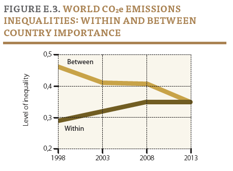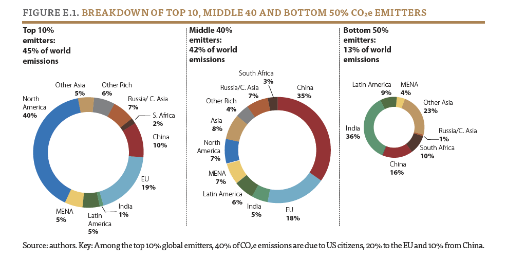 Huge N. American and European share in top 10% and total absence in bottom 50% shows who is responsible for emissions even today. C&P argues based on figure below that individual high-emitters across all countries are important.