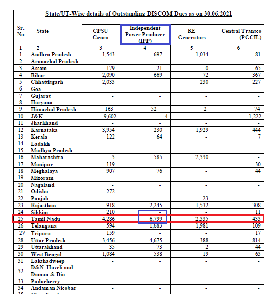 2021 ஜீன் மாதம் வரை மத்திய அரசு கணக்கின்படி தனியார் மின் உற்பத்தியாளர்களுக்கு ரூ.6,799 கோடி நிலுவையில் இருந்தது