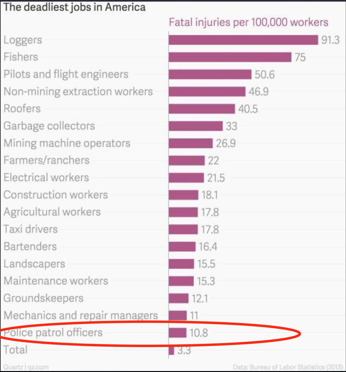 @MintPressNews Policing is NOT a dangerous job; the majority of cop deaths being traffic accidents. Virtually any outdoors or driving profession is far more dangerous. Bartenders are also significantly more at risk of death than cops.
