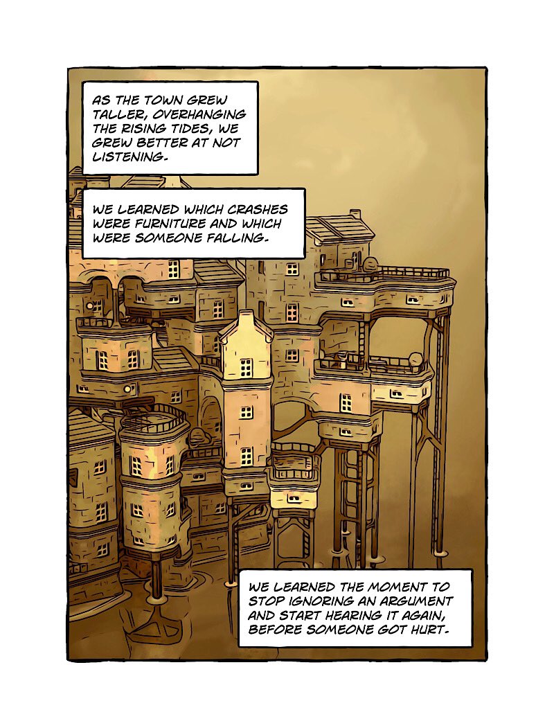 I have been playing around with #Townscaper, a neat little building...toy? game? thingy?...which recently ported to mobile, and spent probably too much time thinking about these odd little towns on the water, which meant that eventually a little weird fan comic came out. 1/11
