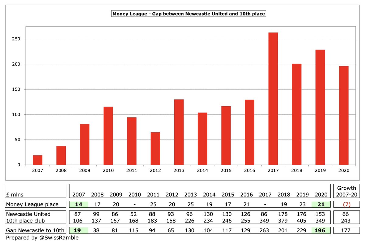 It might seem like pie in the sky for #NUFC to reach these heady heights, especially as their £153m revenue in 2020 was less than half of sixth-placed #AFC £343m and miles below #MUFC £509m. However, before Ashley arrived, Newcastle had 6th highest revenue in England.