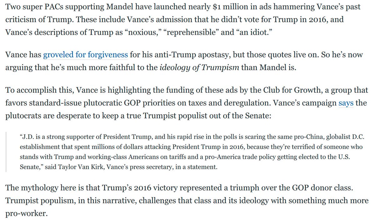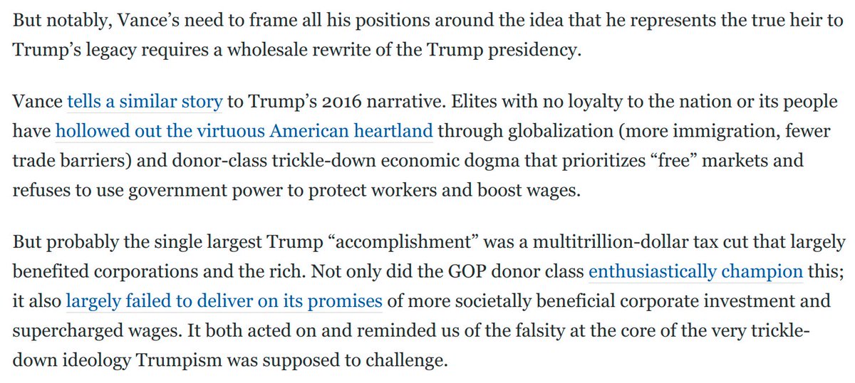 Poor JD Vance. He' getting hammered by $1 million in ads reviving his past attacks on Trump. Vance is desperately atoning by claiming to be the real heir to Trump's populist legacy, as if GOP voters care more about that than about Trump himself. My latest: washingtonpost.com/opinions/2021/…
