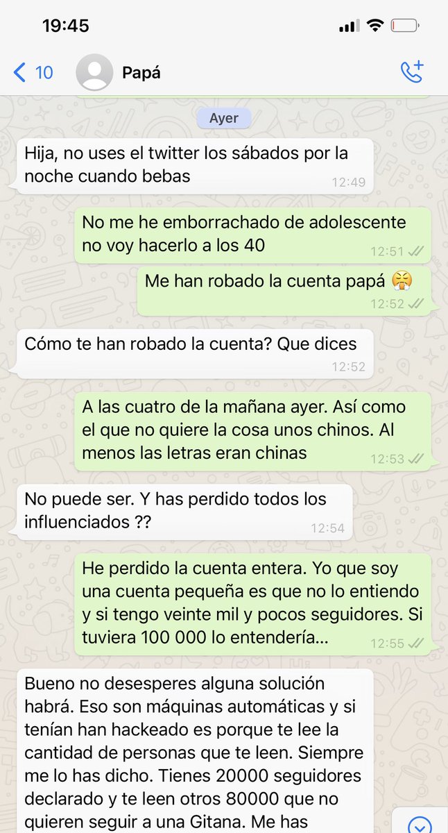 Tengo muchas, muchísimas conversaciones privadas. Algunas con contenido delicado, de personas que me piden ayuda para resolver problemas con alumnado gitano. O de mujeres que me piden opinión sobre temas culturales. Si esas conversaciones salían a la luz me daba algo. No las