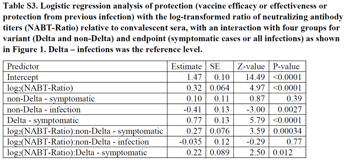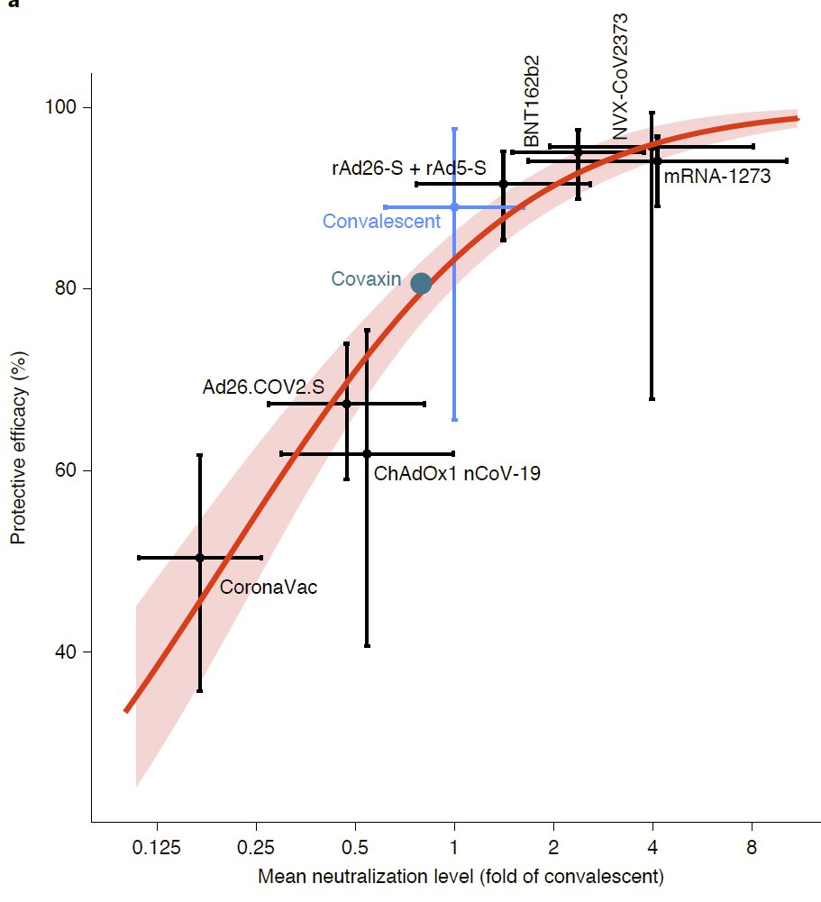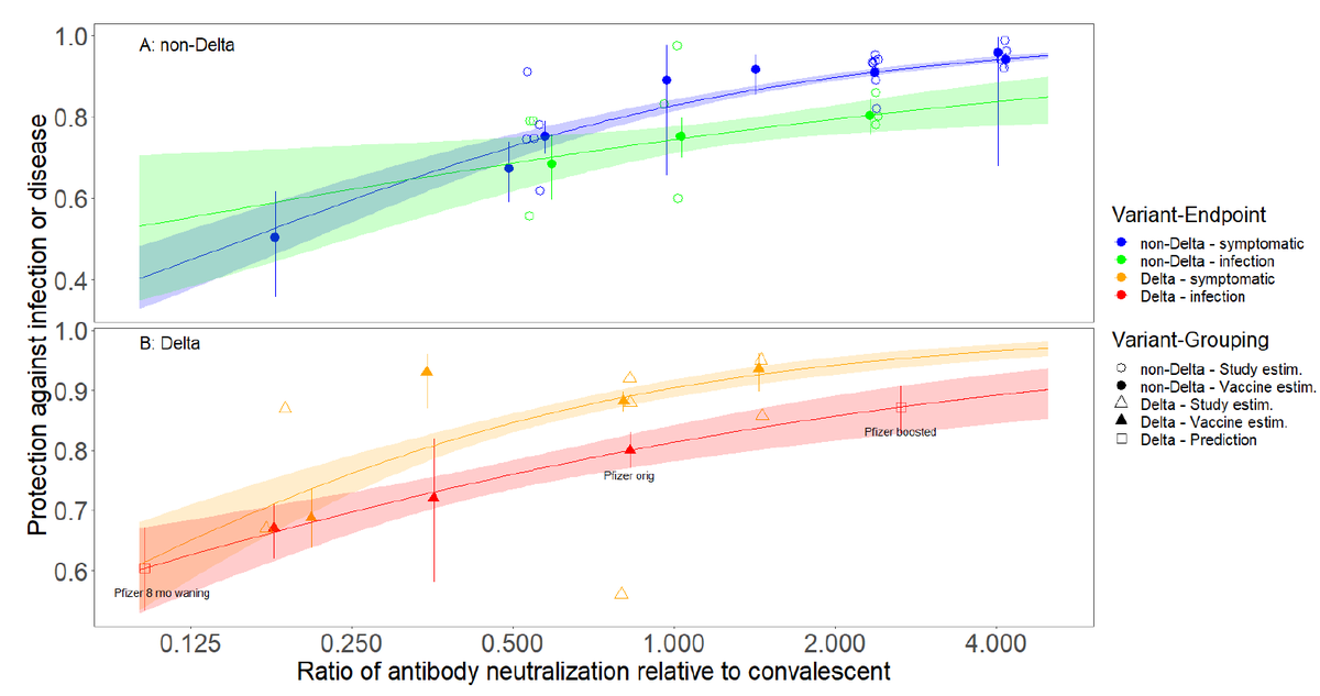 The relationship b/w protection against infection & neutralizing antibody levels (relative to convalescent sera) was strong, although data for Delta were limited to a few vaccines studied in rich countries (Pfizer, Astrazeneca). Protection was higher vs disease than infection.