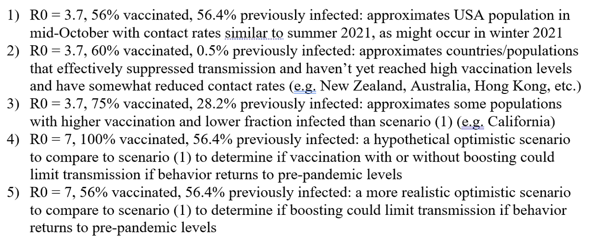 We considered 5 several scenarios that varied vaccine coverage, fraction previously infected, & contact rates (which scale R0 & Rt) which roughly describe, using mid-October data: USA, CA, New Zealand w/ summer surge 2021 (R0=~3.7) or pre-pandemic contact rates (R0=~7).