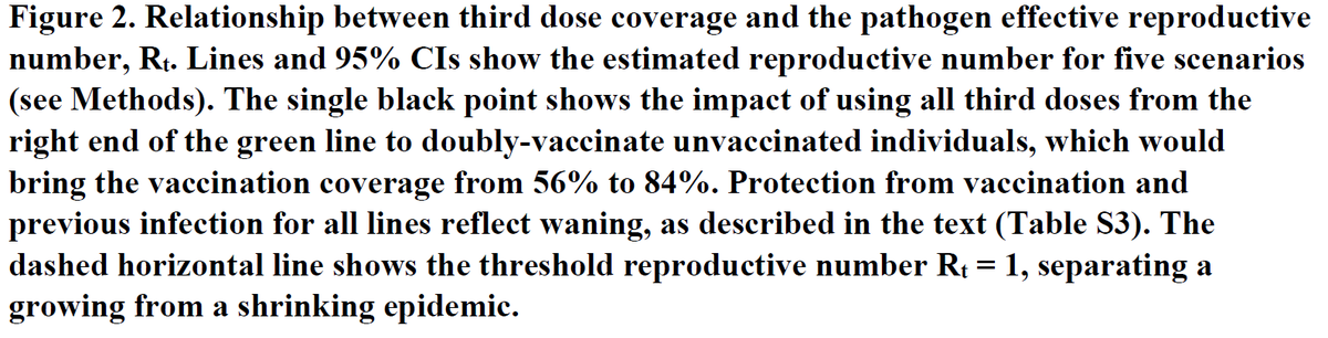 Finally, as expected, using 3rd doses to vaccinate unvaccinated is much more effective. Black dot shows Rt if all 3rd doses used at right end of green line were instead given to unvaccinated (2 shots each) to push coverage 56->84%. Much better, if it could be done.