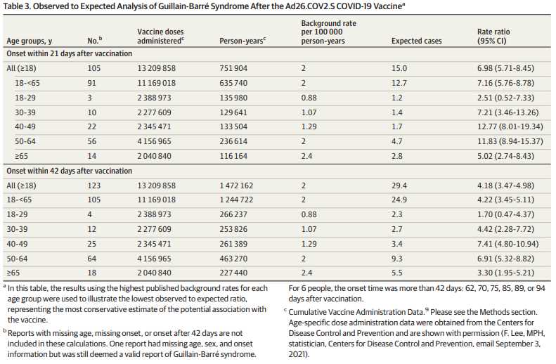 ・2021年7月24日時点において、ヤンセンワクチン接種後に発生した130人の推定GBS例がVERSにより特定された。年齢の中央値は56歳(IER 45-62)、111人(86.0%)が65歳未満であり、77人(59.7%)が男性だった。