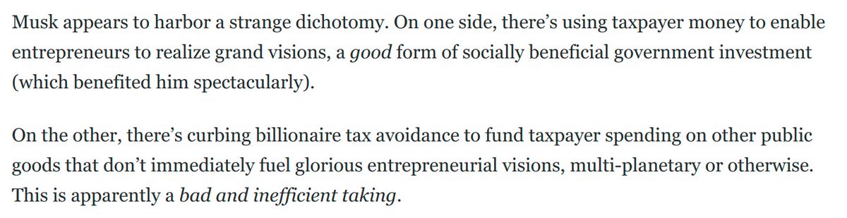 Musk's frame is all wrong. Not only did his glorious multiplanetary entrepreneurial visions benefit from extensive government help; the megarich have benefited as as class from a whole series of *policy choices* channeling income, wealth and rents upward: