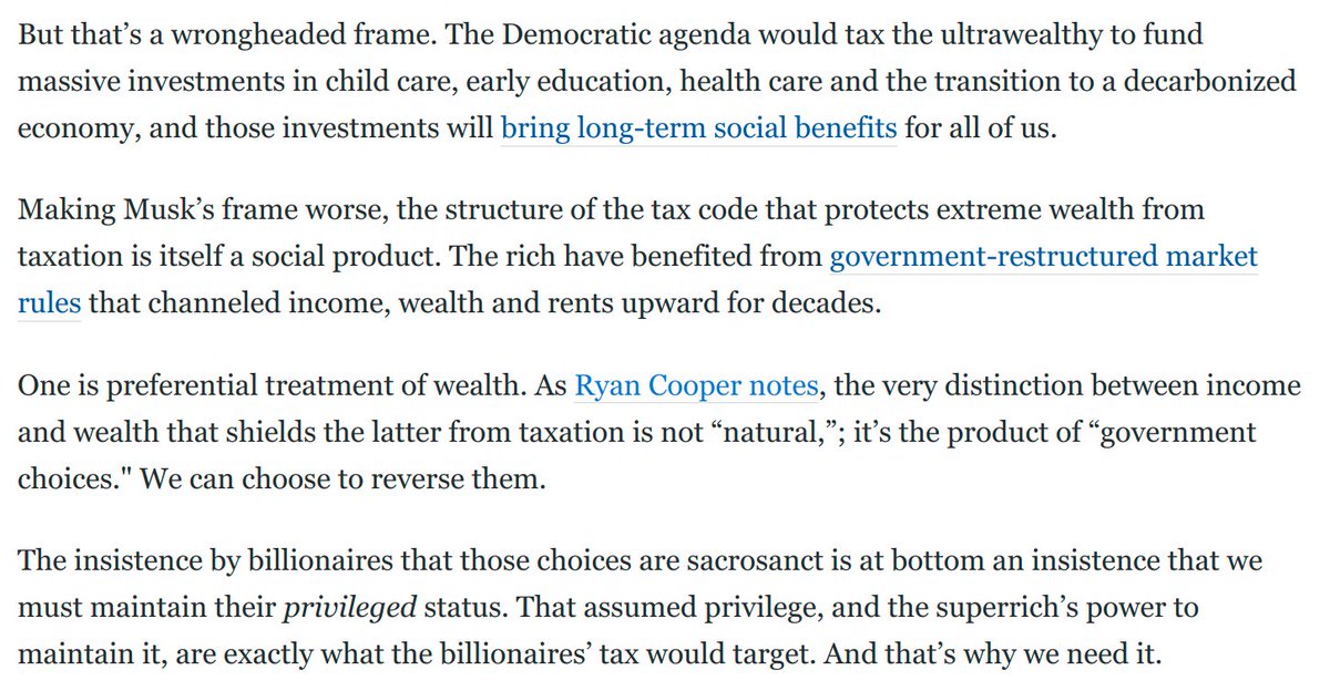 Elon Musk's absurd opposition to the billionaires tax shows exactly why we need it. Billionaires like him have benefited from policy choices that helped them build huge fortunes. One is the privileging of wealth, which this new tax would target. My latest: washingtonpost.com/opinions/2021/…
