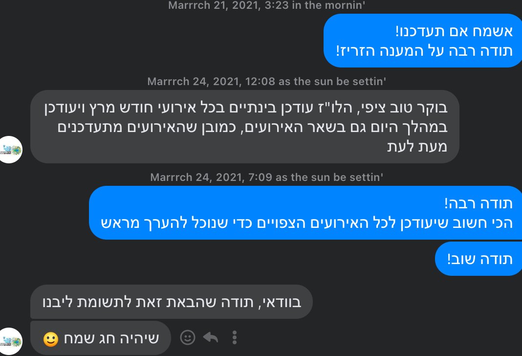 בנוסף, בתקופות בין הסגרים בלומפילד החצופים ערכו אירועים ומשחקים במגרש אבל לא טרחו לעדכן את הלוח, כך שהסקריפט שלי היה חסר תועלת. שינסתי מתניים ויצרתי איתם קשר בפייסבוק - ולשמחתי הם אפילו ענו ותיקנו את התקלה! [7/12]