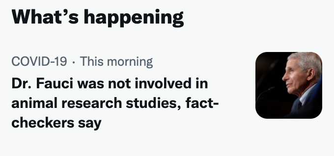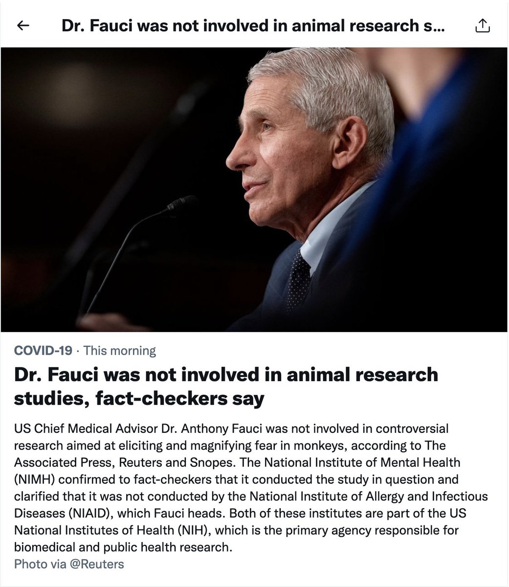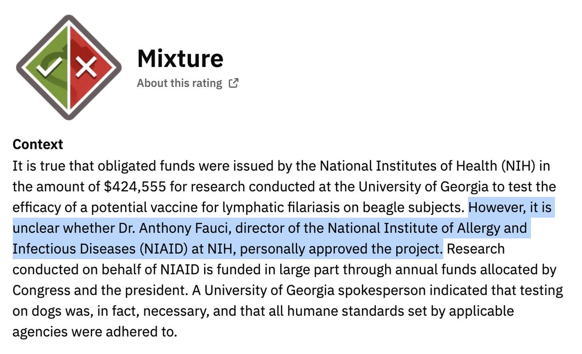 The effect, of course, is to create the impression that the entire story of Fauci's oversight of four decades' of animal experimentation is bunk, and is just a partisan conspiracy theory. Which is completely untrue. I can't prove it but I suspect that's its *intended* effect.