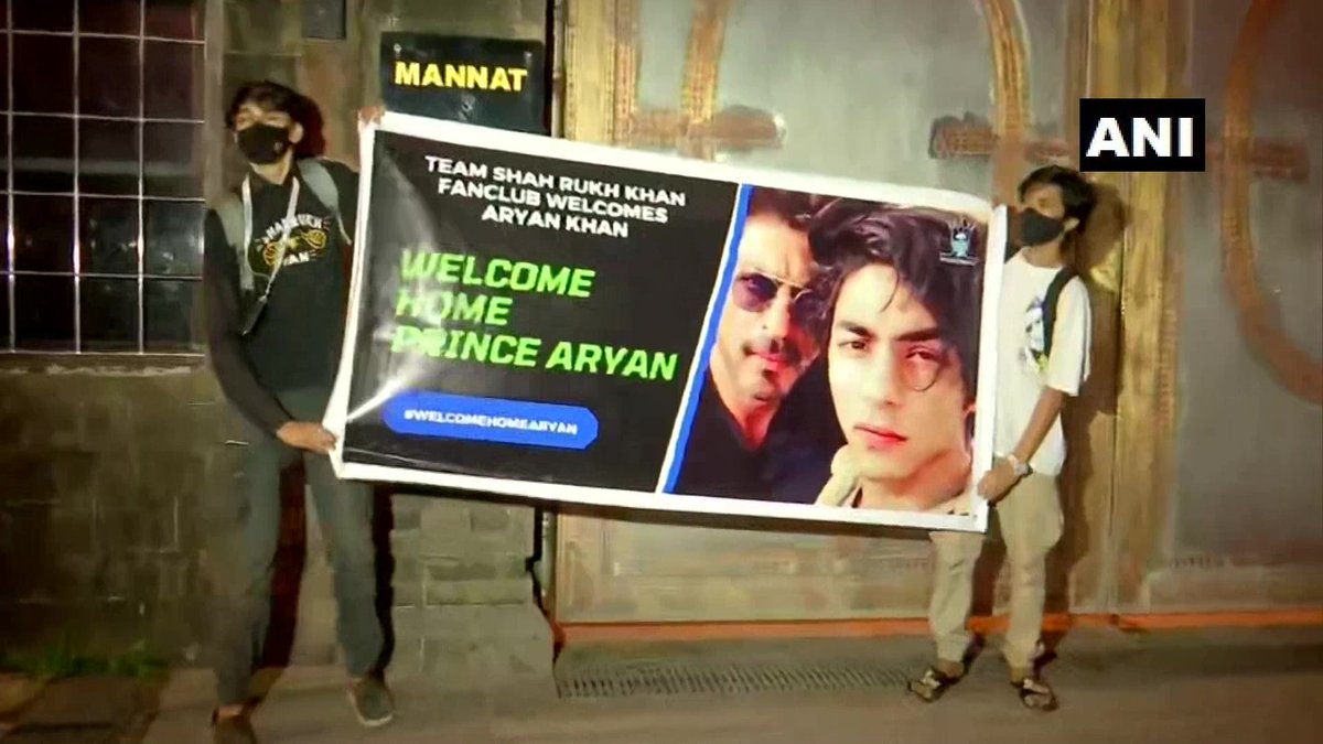 #AryanKhanCase | Shah Rukh Khan's fans celebrate outside the actor's residence 'Mannat' in Mumbai after Bombay High Court granted bail to his son #AryanKhan in the drugs-on-cruise case.