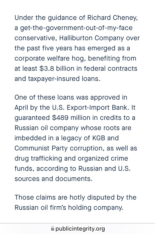 Under the guidance of Richard Cheney, a get-the-government-out-of-my-face conservative, Halliburton Company over the past five years has emerged as a corporate welfare hog, benefiting from at least $3.8 billion in federal contracts and taxpayer-insured loans.