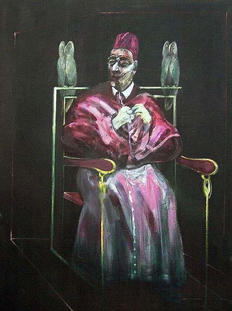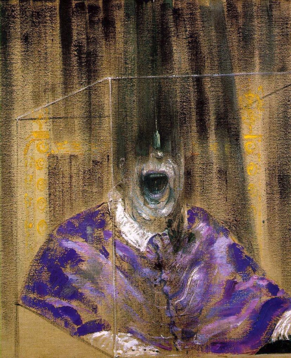 1949 saw him mount an exhibition at the Hanover Gallery, including Head I. Wyndham Lewis described him as ‘one of the most powerful artists in Europe’. 1950 saw him turn to the popes. Head VI was both a treatise on existentialism & a homage to Velázquez.