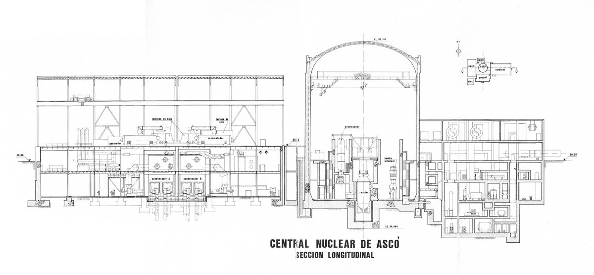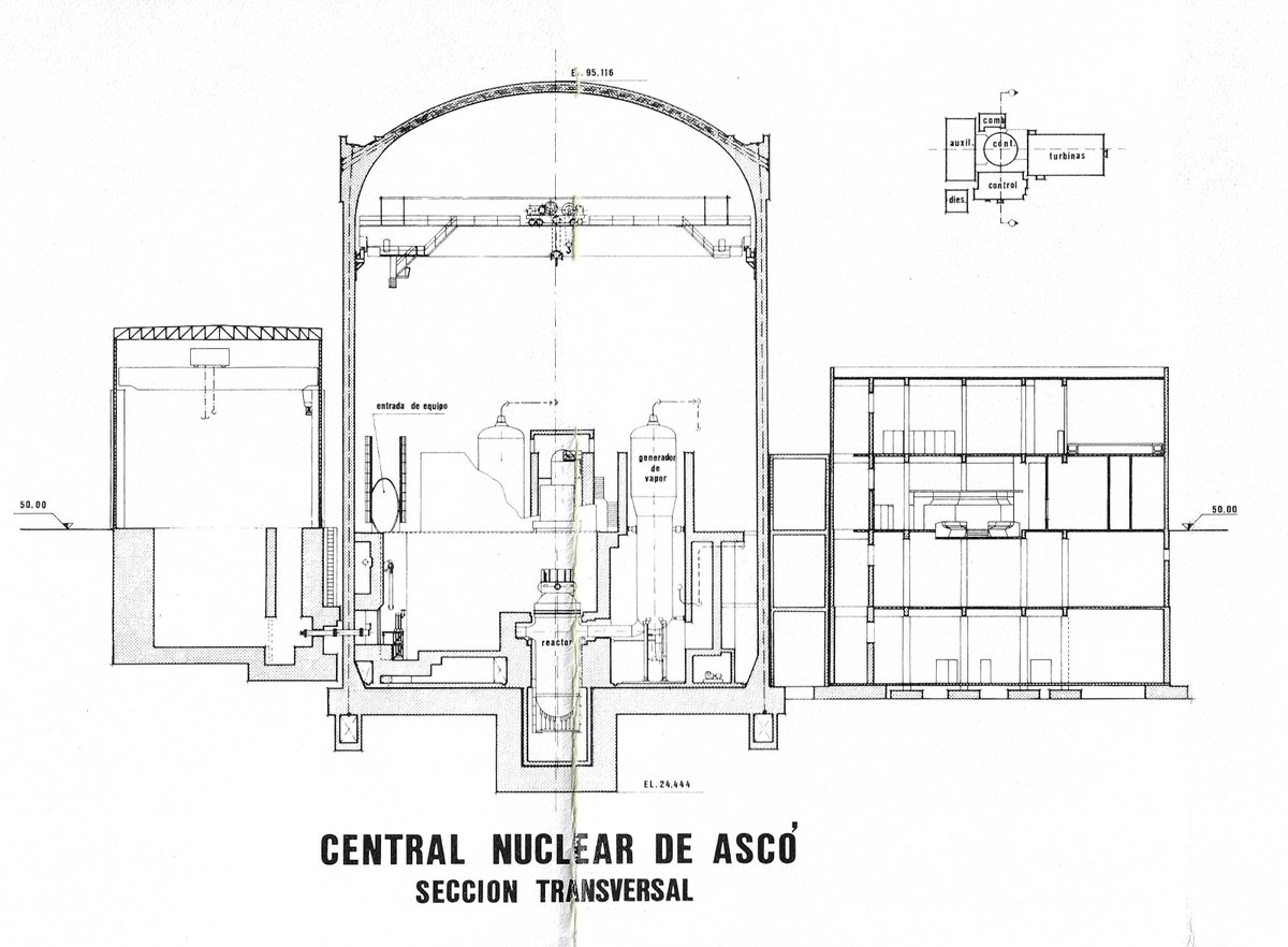 En el plano original se puede observar la ausencia de la torre de refrigeración, que fue una construcción posterior. Ascó disponía originalmente solo de torres de tiro forzado con ventiladores (41).