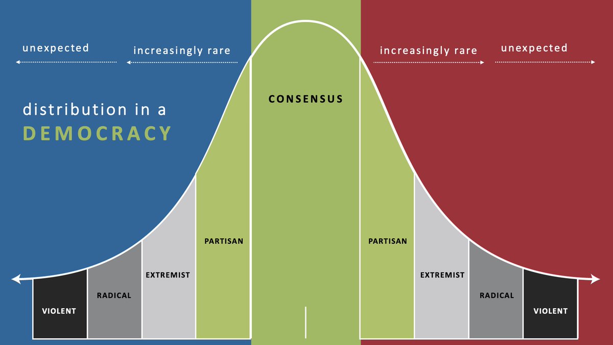 Governance and politics in a democracy should fall upon a bell curve where the normal moves to the rare and unexpected. Most should fall into consensus or partisan within the norms of two sides of political opponents attempting to win over citizens through ideas.