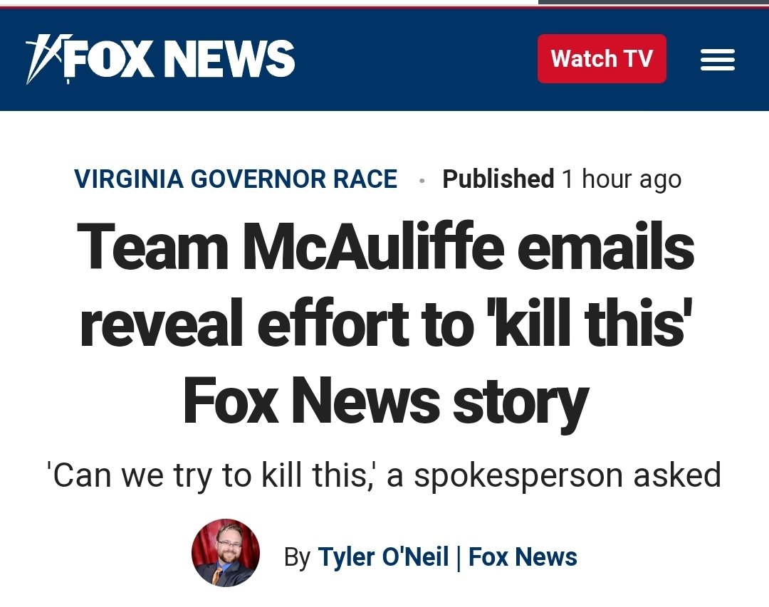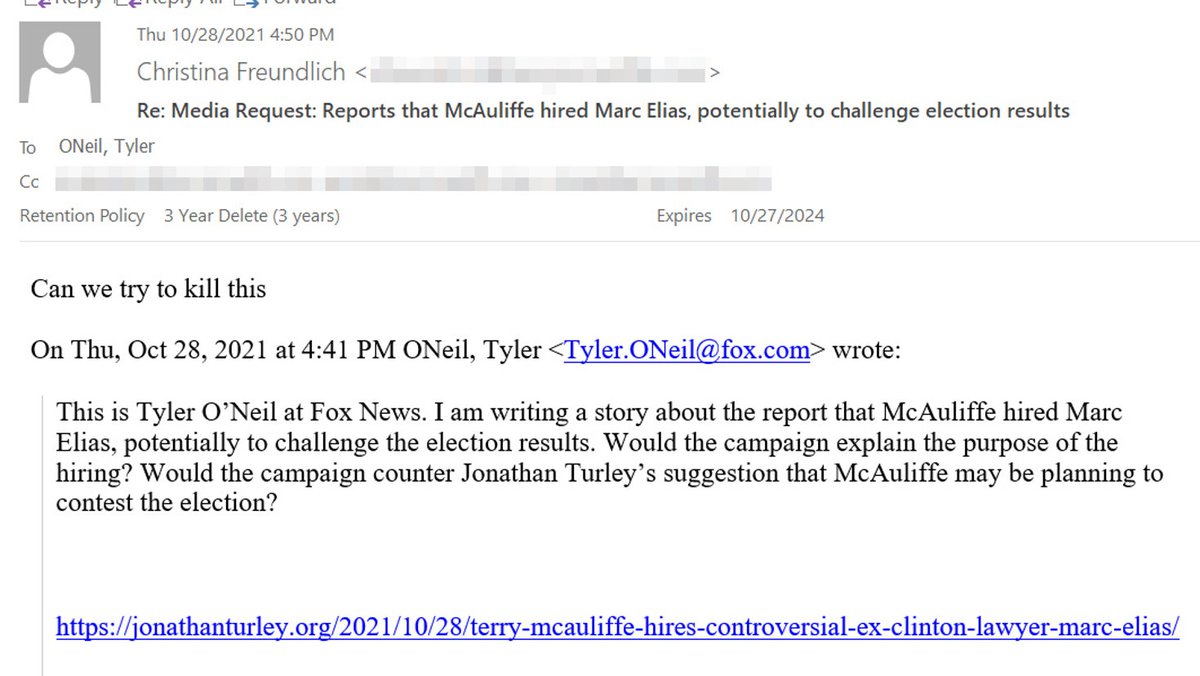 Fox News reporter: "I am writing a story about the report that McAuliffe hired Marc Elias, potentially to challenge the election results [...]"