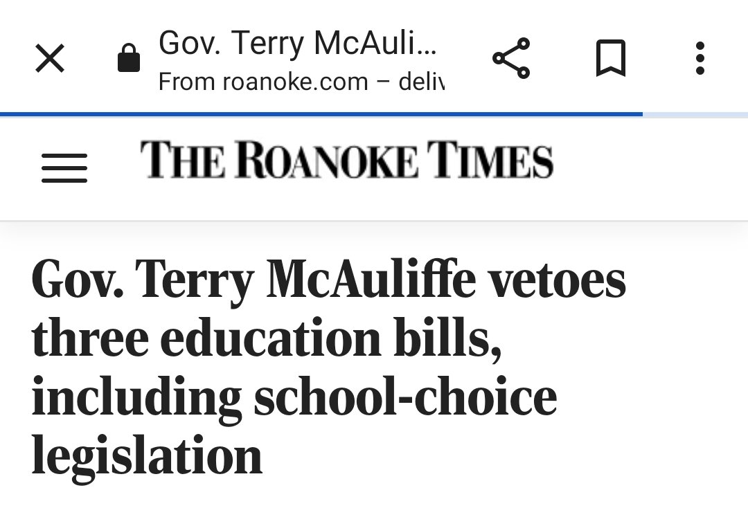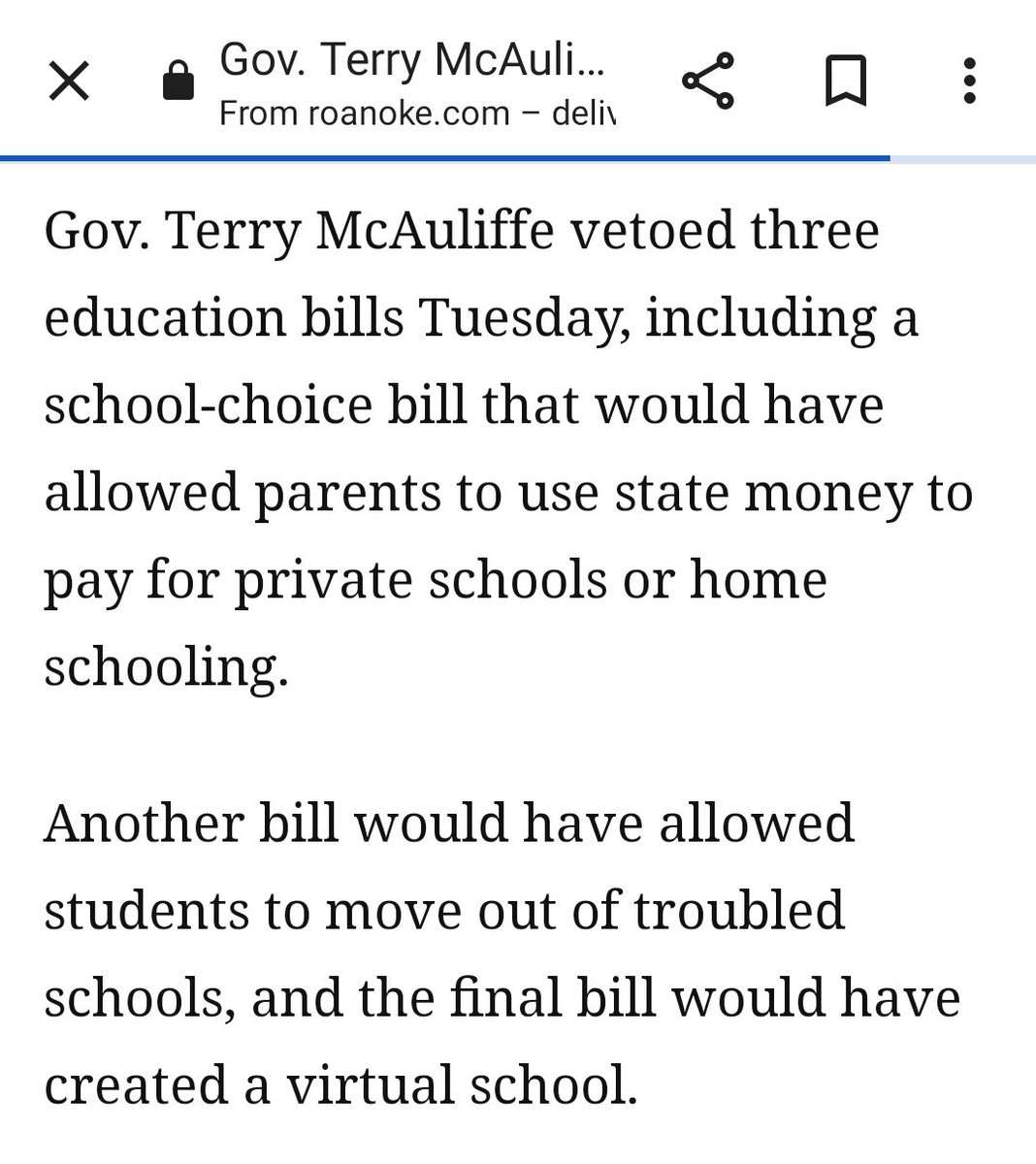 In 2016 Terry McAuliffe vetoed a transparency bill that would have required public schools to "notify the parent of any student whose teacher reasonably expects to provide instructional material that includes sexually explicit content"