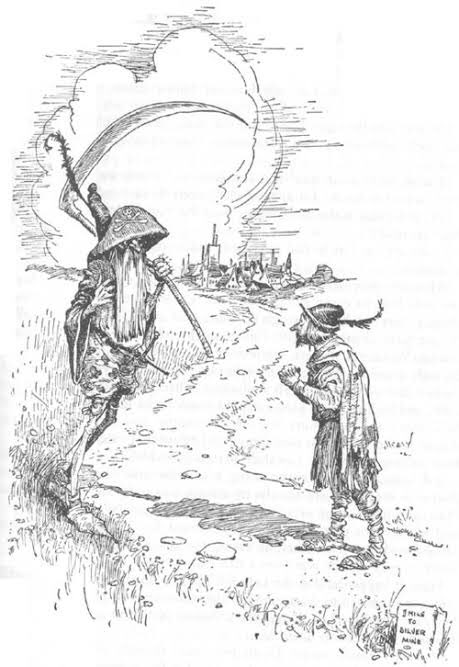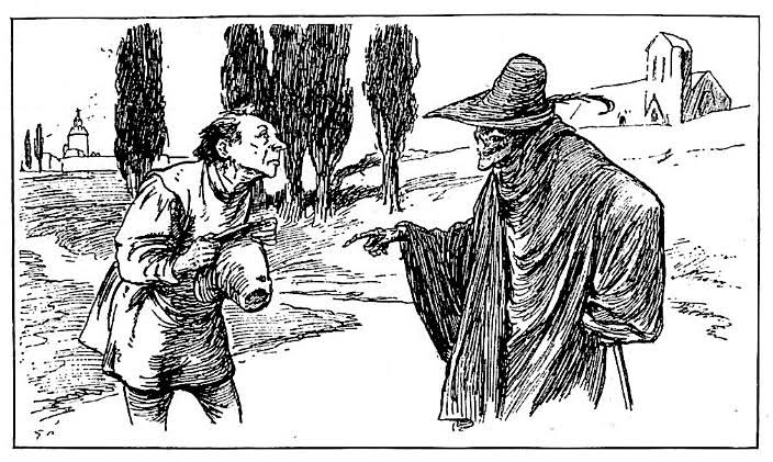 Cuando piensa que debe estar cerca, vuelve otra vez la daré atrás ¡Cuál no fue su terror al ver al compañero que su infeliz suerte le destinaba!: “¿por que te llenas de pavor al verme, si tantas veces me has llamado a gritos?” Le preguntó la huesuda.