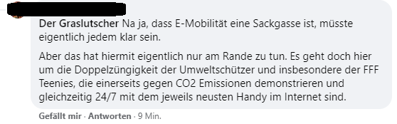 "Die Doppelzüngigkeit der FFF Teenies", denn die kaufen ja alle Tesla, muss man wissen.