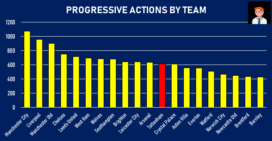 Despite holding the 9th most possession in the league, Spurs sit 13th for progressive actions in the Premier League.