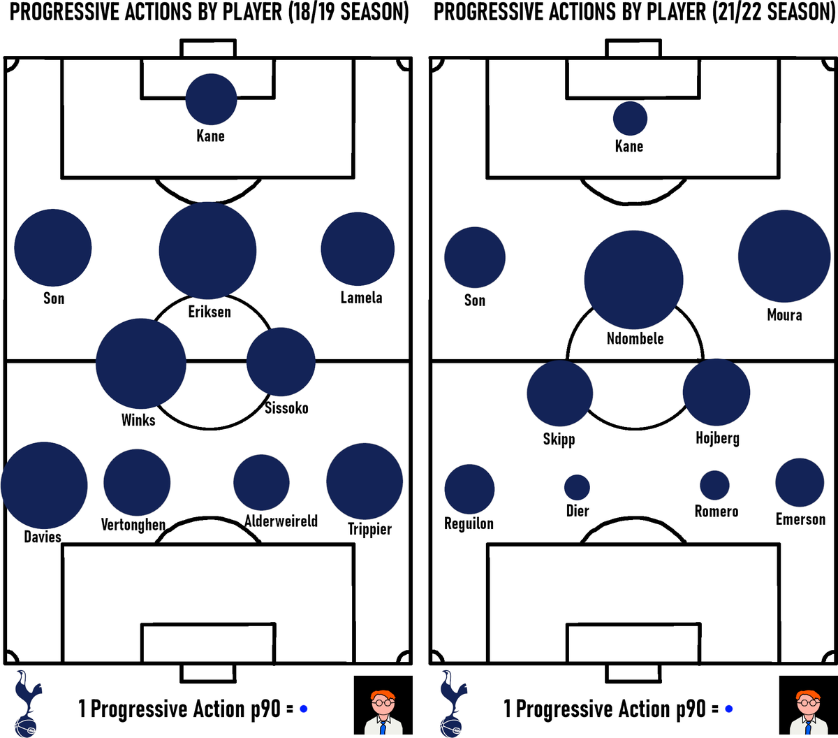 Here's a damning comparison with the 18/19 season - Vertonghen & co were great at moving the ball up in buildup play - Eric Dier and Romero are non existent.