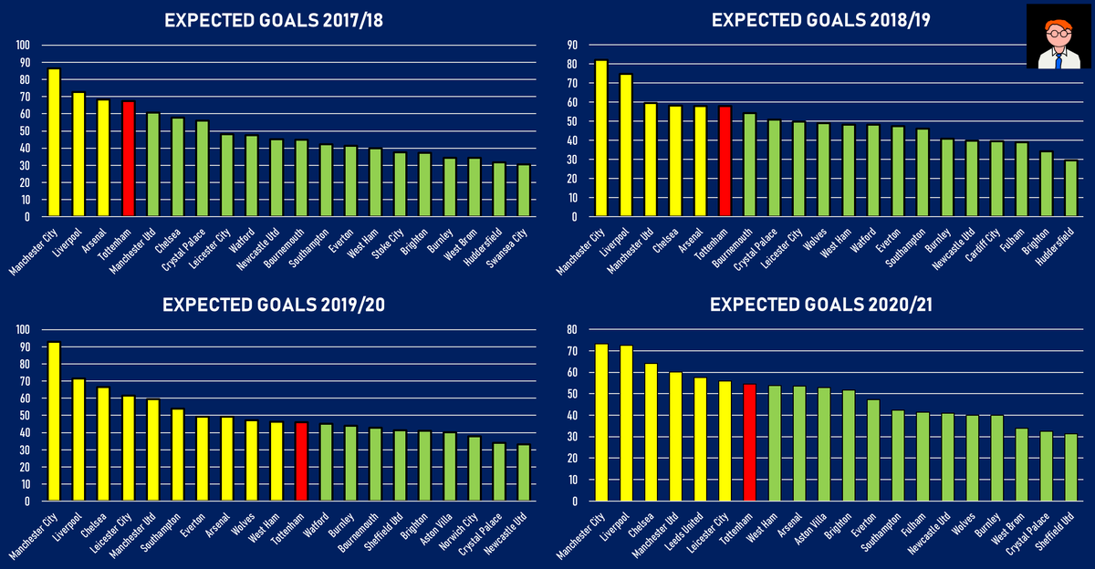 Here are the rankings for pure expected goals each season from 2017/18 - 20/21