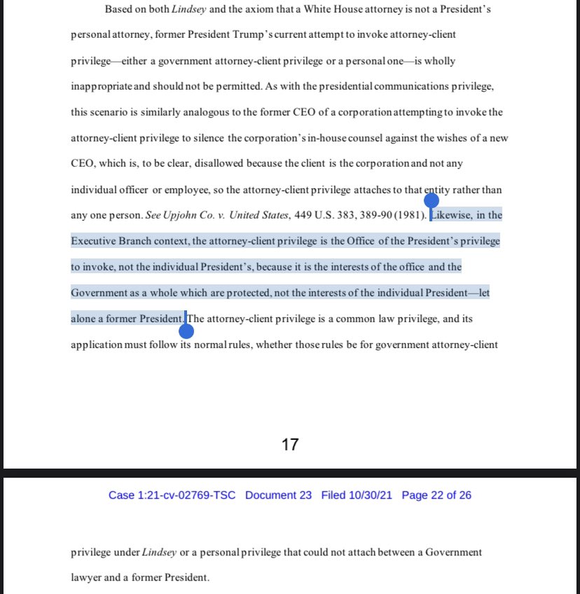 AND: Trump has no ability to claim attorney-client privilege over advice given to “the office of the president.”