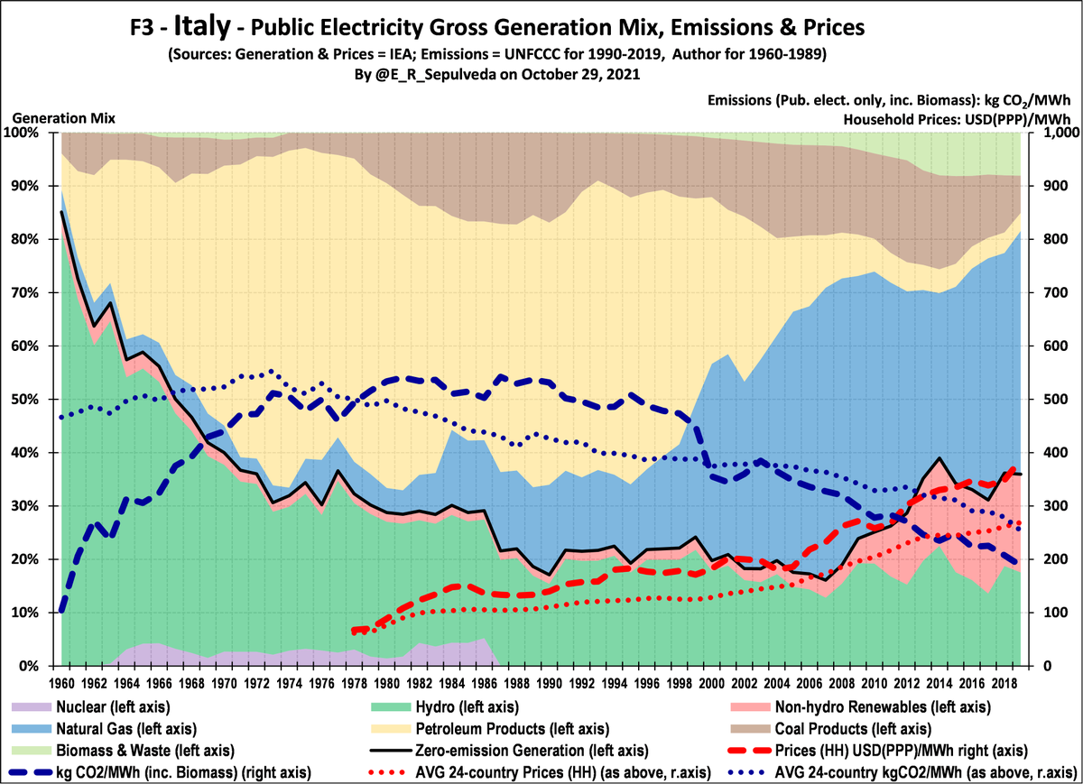 Italy is interesting for two reasons: no other country increased emissions as much from 1960 to 1990, because all new demand was met by FF; & only sample country to shut down nuclear (post-Chernobyl).