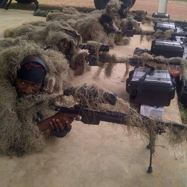 A Nigerian Army marksman providing overwatch from a cliff for a squad clearing out an area around the Mandara Mountain axis against ISIS .