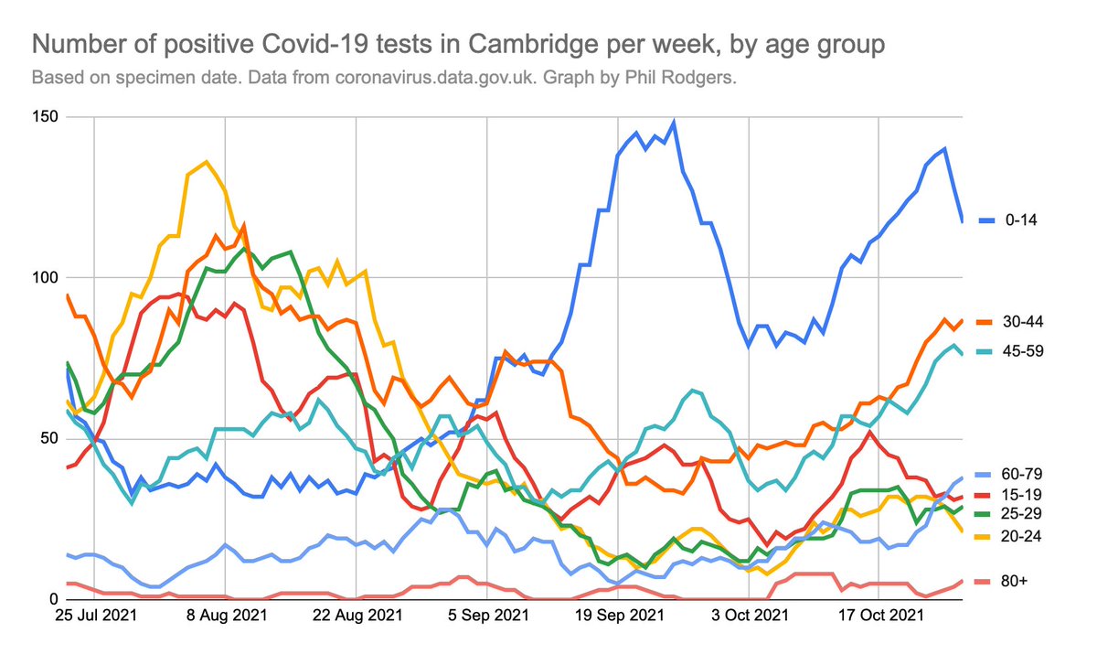 Here's the age group picture - quite a complex one, with school cases falling again, but a big rise for the 30-59s. Cases are low in the student age groups, and this is reinforced by data from @Cambridge_Uni's testing programme. However, numbers are up for the over-60s.