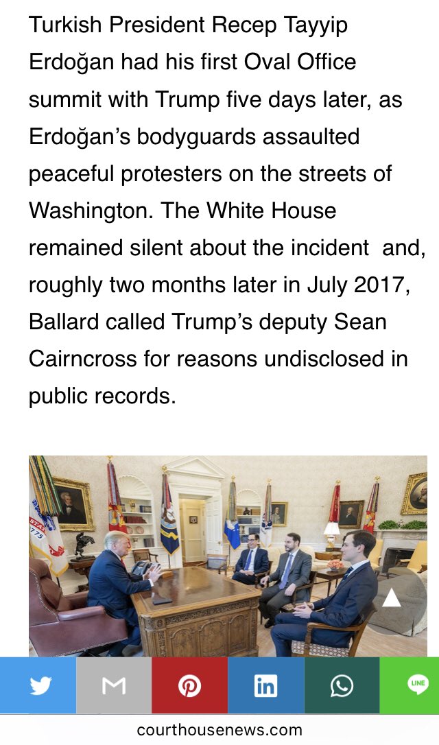 The White House remained silent about the incident and, roughly two months later in July 2017, Ballard called Trump’s deputy Sean Cairncross for reasons undisclosed in public records.