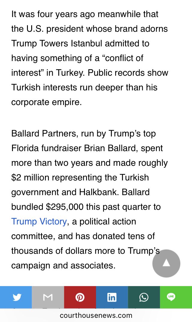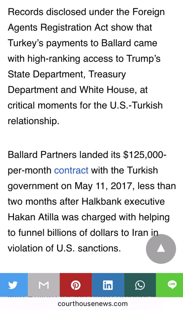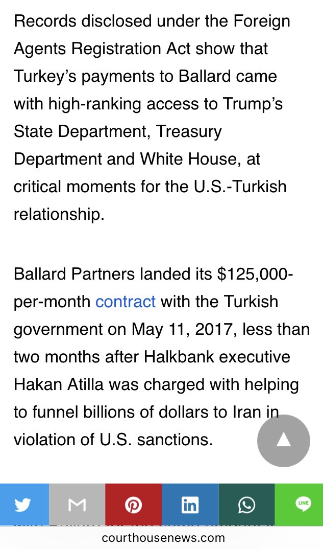 Records disclosed under the Foreign Agents Registration Act show that Turkey’s payments to Ballard came with high-ranking access to Trump’s State Department, Treasury Department and White House, at critical moments for the U.S.-Turkish relationship.
