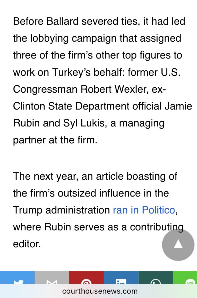 Before Ballard severed ties, it had led the lobbying campaign that assigned three of the firm’s other top figures to work on Turkey’s behalf: former U.S. Congressman Robert Wexler, ex-Clinton State Department official Jamie Rubin and Syl Lukis, a managing partner at the firm.
