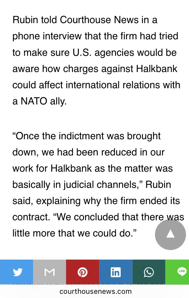 “Once the indictment was brought down, we had been reduced in our work for Halkbank as the matter was basically in judicial channels,” Rubin said, explaining why the firm ended its contract. “We concluded that there was little more that we could do.”
