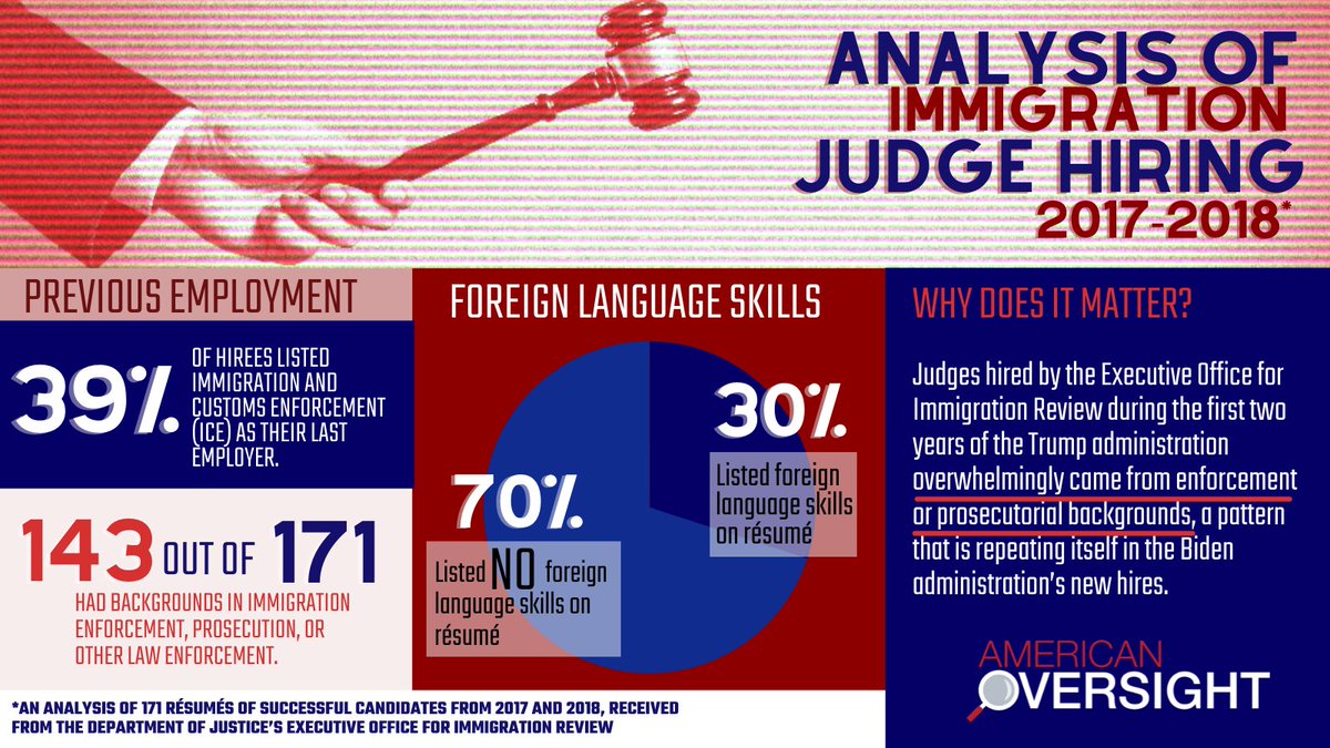 Both the Trump and Biden administrations have followed the same pattern in hiring immigration judges: a high percentage previously worked for Immigration and Customs Enforcement or other law enforcement agencies. americanoversight.org/why-biden-can-…
