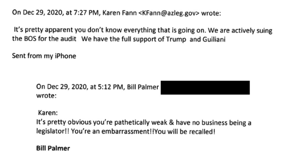 Records we obtained show that after a constituent pressured Arizona Senate President Karen Fann to investigate the results, Fann responded, “It’s pretty apparent you don’t know everything that is going on.”