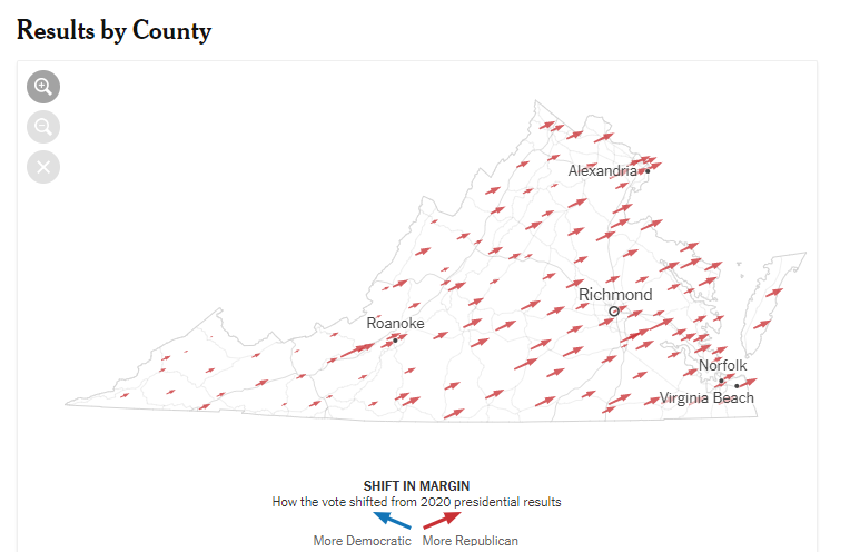 This map blows apart almost all the takes about McAuliffe and Youngkin and CRT and education and suburban parents and school closures and so forth! Because if any of them were true, you could see it on this map. The suburbs would go one way. Other places would be different.