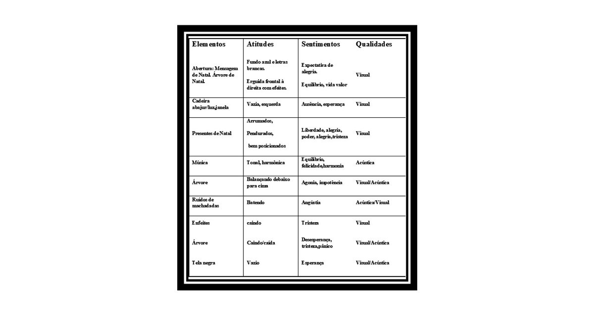 Da composição: os elementos morfológicos conforme descrição abaixo. O filme é composto basicamente de quatro sequências, sendo que apenas a segunda é composta de imagem dinâmica.