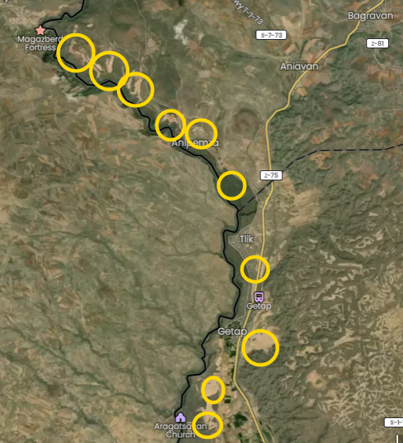 Sınırımızın hemen bu kısmında Arpaçay deresinin öte yanındaki (sarı renk) kürt köylerinden sadece Yezidi Kürtlere ait birkaç köy bırakılmıştır. Stalin, onları sınırdan sürmüştür. Ermeniler ise kalıntılarını bile kazımıştır coğrafyadan. Artık uyduda burası böyle görünmektedir.