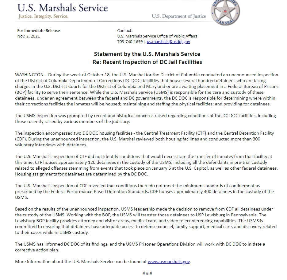 The U.S. Marshal's Service has released its statement about its inspection at the D.C. Jail.