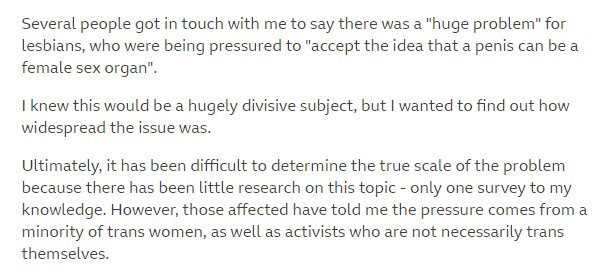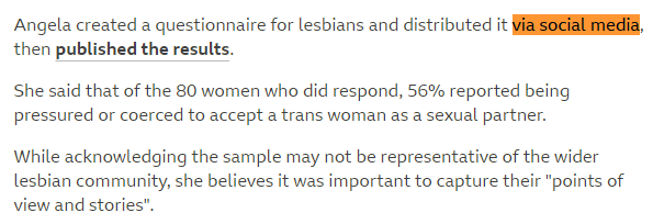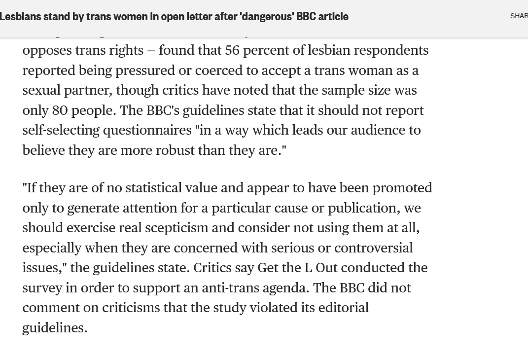 In an article about the BBC's article, and the critical backlash it received from lesbians and the rest of the queer community, NBC notes that including the social media survey was a violation of the BBC's own guidelines.
