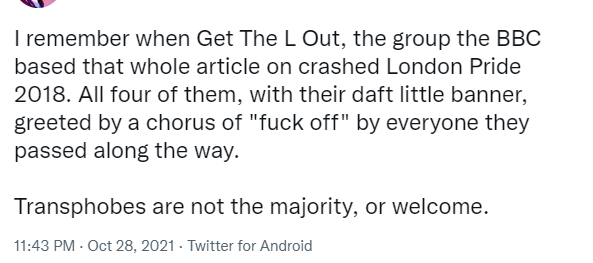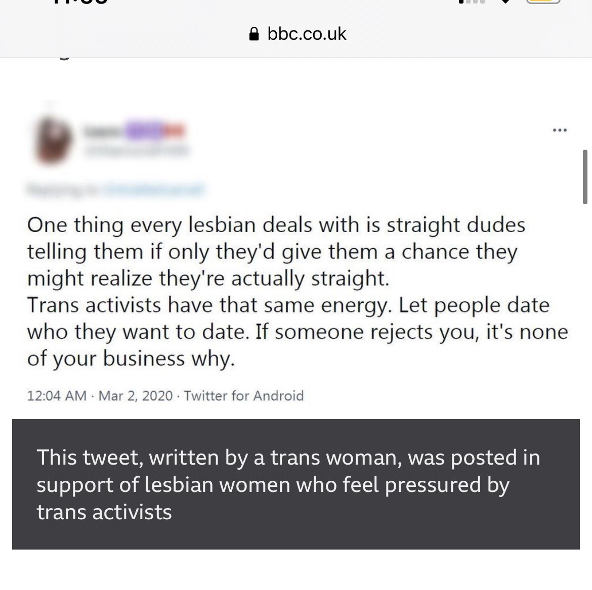 The article includes a quote from a trans twitter user which Caroline Lowbridge describes "in support of lesbian women who feel pressured by trans activists".