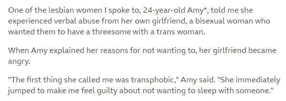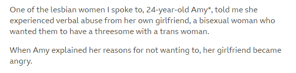 So to recap, out of three people cited to argue that trans women are pressuring lesbians into sex: