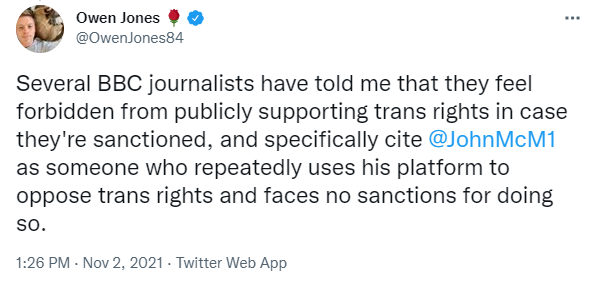 McManus's behaviour is only one of many examples of the BBC's abandonment of neutrality when it comes to LGBTQ+ people.
