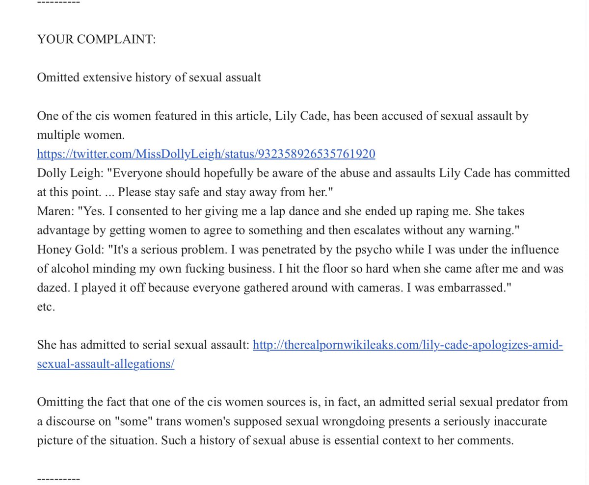 It's also worth noting that Lily Cade's inclusion in the article does nothing to support its headline's claim that trans people are pressuring lesbians into sex.