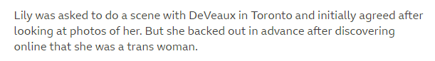 Her story is that she didn't want to do a porn scene with a trans woman, so she didn't, and nothing at all happened.