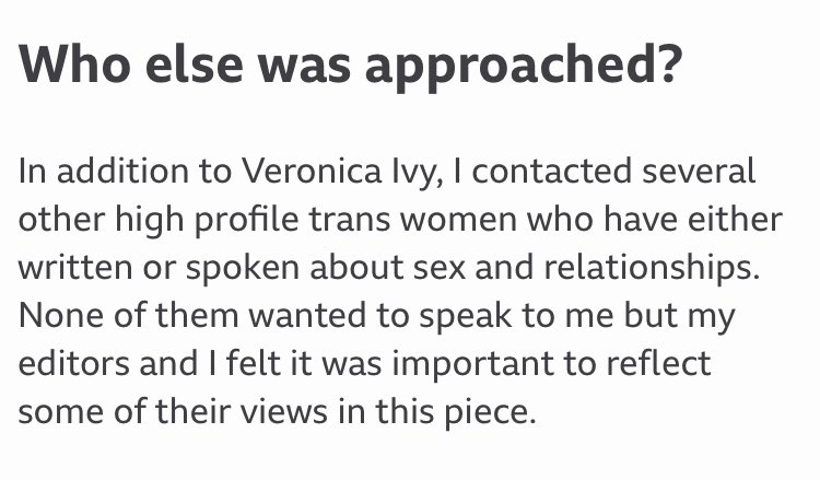 We previously failed to flag up that the article actively lies, claiming that no other "high profile trans women" spoke with her.