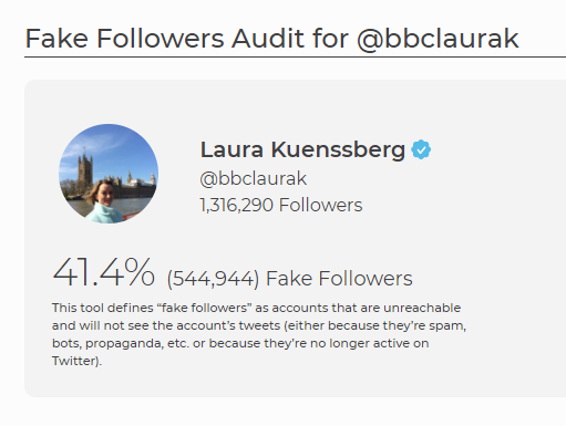I've been checking twitter accounts for a long time now, & have only ever seen two accounts with more than 40% fake followers: Jacob Rees-Mogg, & now Laura Kuenssberg.